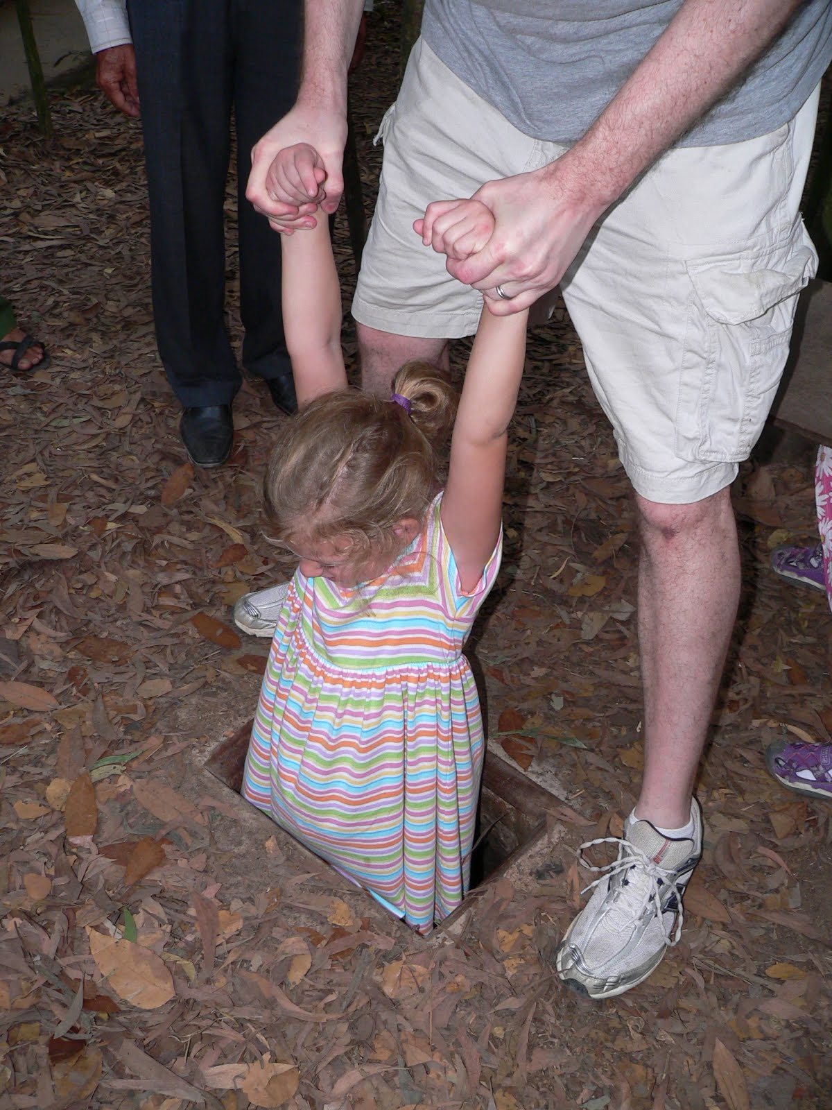 We then headed back on the bus and on our way to the Cu Chi Tunnels. The tunnels of Củ Chi are a network of connecting underground tunnels located in the Củ Chi district of Ho Chi Minh City (Saigon), Vietnam, and are part of a much larger network of tunnels that underlie much of the country. The Củ Chi tunnels were the location of several military campaigns during the Vietnam War. The tunnels were used by the Vietnamese as hiding spots during combat, as well as serving as communication and supply routes, hospitals, food and living quarters for numerous fighters. Here is Hannah and Ansley showing us how small the openings were: I have really never considered myself a claustrophobic person but man I think I am. We went into the tunnels for about 60 meters and it had 6 openings where you could come out every 10 meters should you want to so when Hannah said she wanted out at the first opportunity I took it and ran with it! Not only was it really small within it it was really HOT! I never had to crawl but I did have to take off the backpack to just get through to the first opening. To think people LIVED down there! So Ansley decided after she came out that she wanted to finish going through the rest of the tunnels....so she went back in with a girl we met from Australia on the bus and here she is finishing the entire 60 meters!